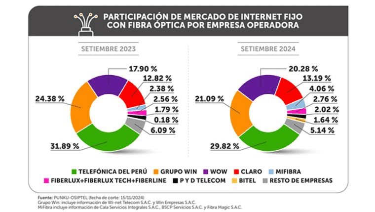 Telefónica y Claro lideran el mercado con el 32.33% y 24.92% de participación, respectivamente. Sin embargo, empresas emergentes como WOW y MiFibra han mostrado un crecimiento considerable. WOW incrementó su participación de mercado en 5.05 puntos porcentuales, mientras que MiFibra experimentó un impresionante aumento del 165.34% en el número de conexiones en comparación al tercer trimestre del 2023