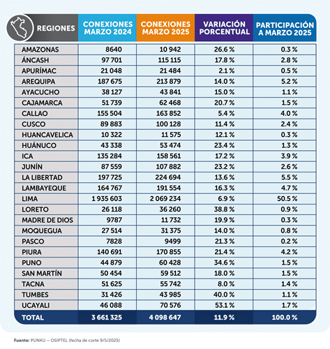 Las regiones (fuera de Lima y Callao) crecieron 18.8 %, alcanzando el 45.5 % del total de conexiones.